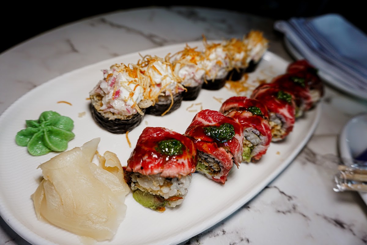 Toasted green onion pancakes, spicy tuna, hamachi, salmon, and shrimp.